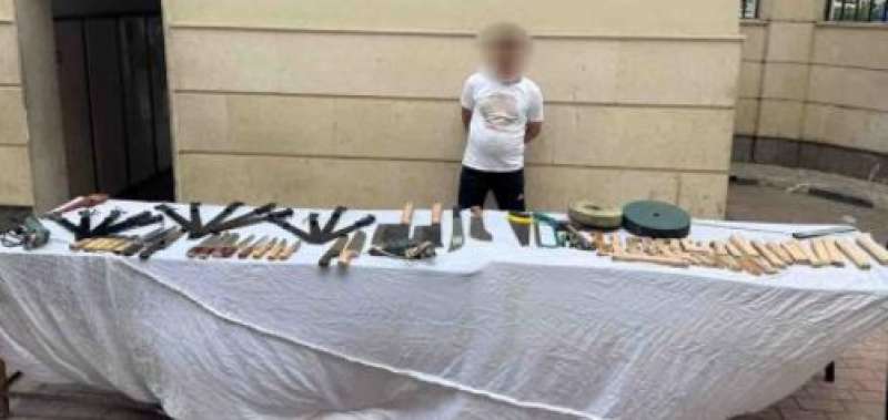 وعقب تقنين الإجراءات تم ضبطه حال تواجده بالورشة المشار إليها، وعُثر بداخلها على (36 قطعة سلاح أبيض مختلفة الأحجام – مجموعة من الأدوات والأجزاء المستخدمة في التصنيع).
