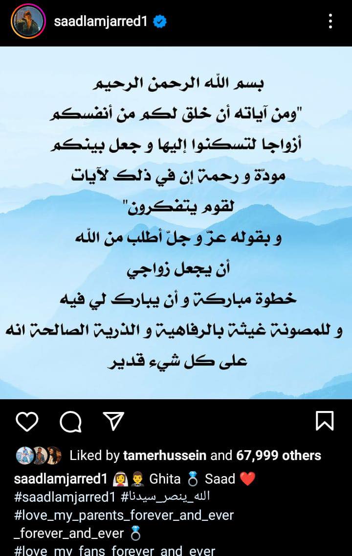 وكتب سعد المجرد عبر حسابه الرسمي بانستجرام: "بسم الله الرحمن الرحيم ومن آياته أن خلق لكم من أنفسكم أزواجًا لتسكنوا إليها وجعل بينكم مودة ورحمة إن في ذلك لآيات لقوم يتفكرون"، وبقوله عز وجل أطل من الله أن يجعل زواجي خطوة مباركة وأن يبارك لي فيه وللمصونة غيثة بالرفاهية والذرية الصالح وإنه على كل شيء قدير.