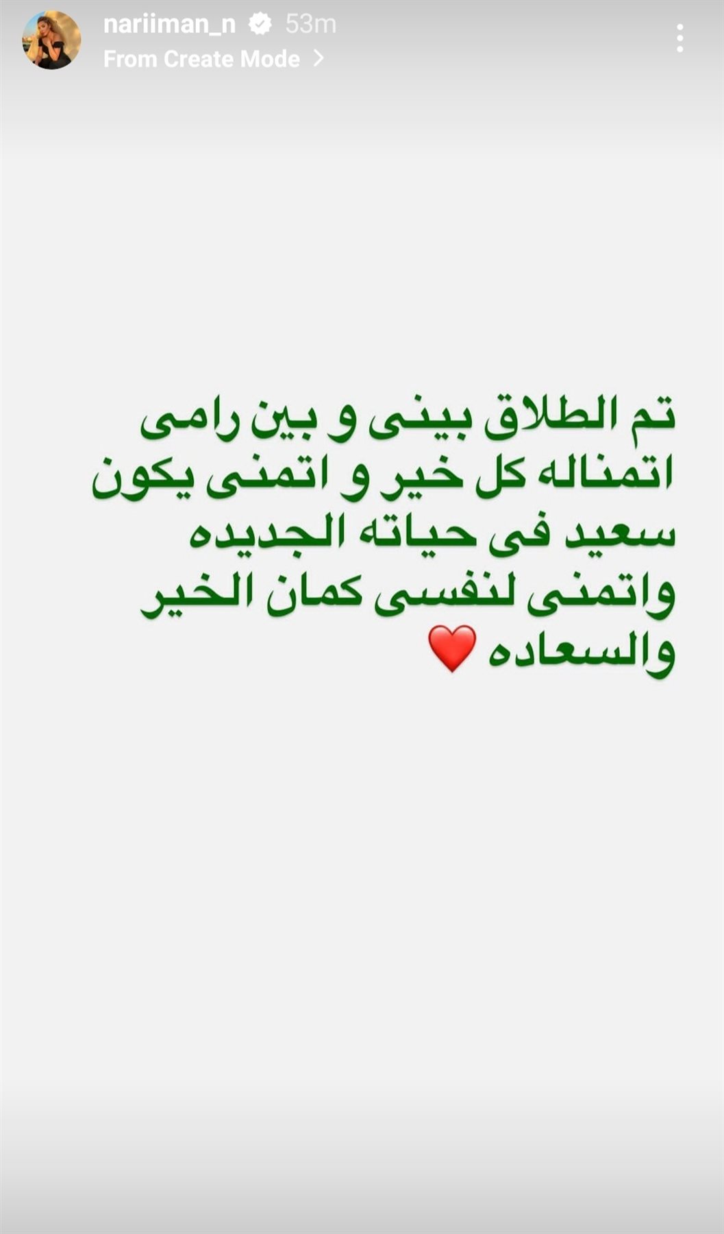 أعلنت المطربة ناريمان انفصالها عن زوجها المطرب رامي جمال، وذلك بعد زواج استمر لمدة 8 سنوات، حيث كتبت ناريمان عبر حسابها الشخصي على موقع تبادل الصور والفيديوهات "إنستجرام" من خلال خاصية "إستوري": "تم الطلاق بيني وبين رامي، أتمناله كل خير وأتمنى يكون سعيد في حياته الجديدة وأتمنى لنفسي كمان الخير والسعادة".