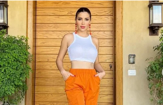 وظهرت نسرين طافش في الصور بإطلالة صيفية متميزة مرتدية “ توب” بيضاء قصيرة وبنطلون باللون البرتقالي.