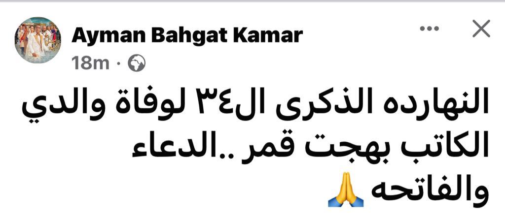ونشر أيمن بهجت قمر عبر صفحته الشخصية بموقع التواصل الاجتماعي "فيسبوك" منشورًا كتب فيه: " اليوم الذكرى الـ٣4 لوفاة والدي الكاتب الكبير بهجت قمر .. الفاتحه والدعاء له".