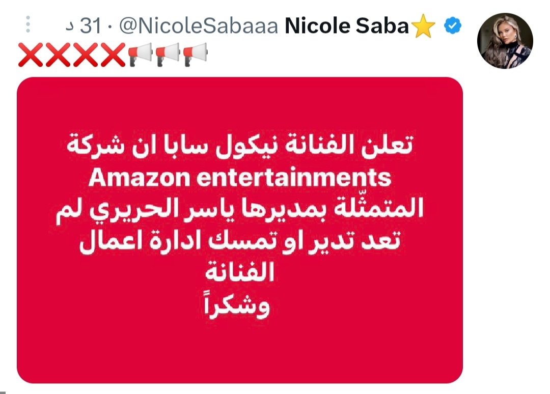 وكتبت نيكول سابا: تعلن الفنانة نيكول سابا أن شركة Amazon entertainments المتمثلة بمديرها ياسر الحريري لم تعد تدير أو تمسك إدارة أعمال الفنانة وشكرا.