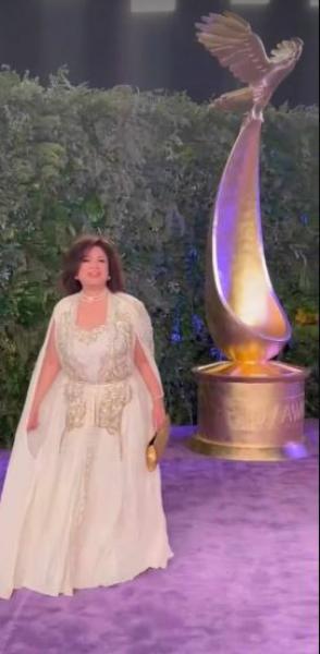 حضرت الفنانة إلهام شاهين، حفل joy awards، الذي انطلق على خشبة مسرح أبوبكر الشدي بالسعودية، مرتدية فستان أنيق باللون الأبيض.