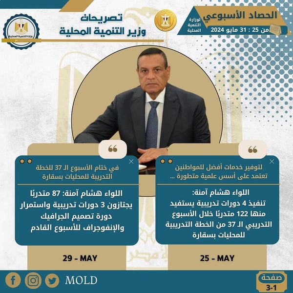 أكد اللواء هشام آمنة، أن مركز التنمية المحلية بسقارة ينفذ الأسبوع الحالي وهو الأسبوع التدريبي السابع والثلاثون من الخطة التدريبية للمحليات للعام المالي الحالي ٤ دورات تدريبية وهي: - دورة "تصميم الجرافيك والإنفوجراف والفيديو والتصوير الفوتوغرافي والمونتاج"، ودورة "تنمية مهارات القيادات فى مجال إدارة الأزمات وإدارة الفعاليات الإعلامية للأزمات والأمن القومي والتصدي للشائعات"، ودورة "تحسين الخدمات ومنظومة المراكز التكنولوجية"، بالإضافة إلى الأسبوع الثاني من دورة "اللغة العربية واستخدامها في رفع كفاءة المخاطبات والتقارير من حيث الصياغة وسلامة اللغة"، ويستفيد من هذه الدورات ١٢٢ متدرباً من جميع المحافظات.