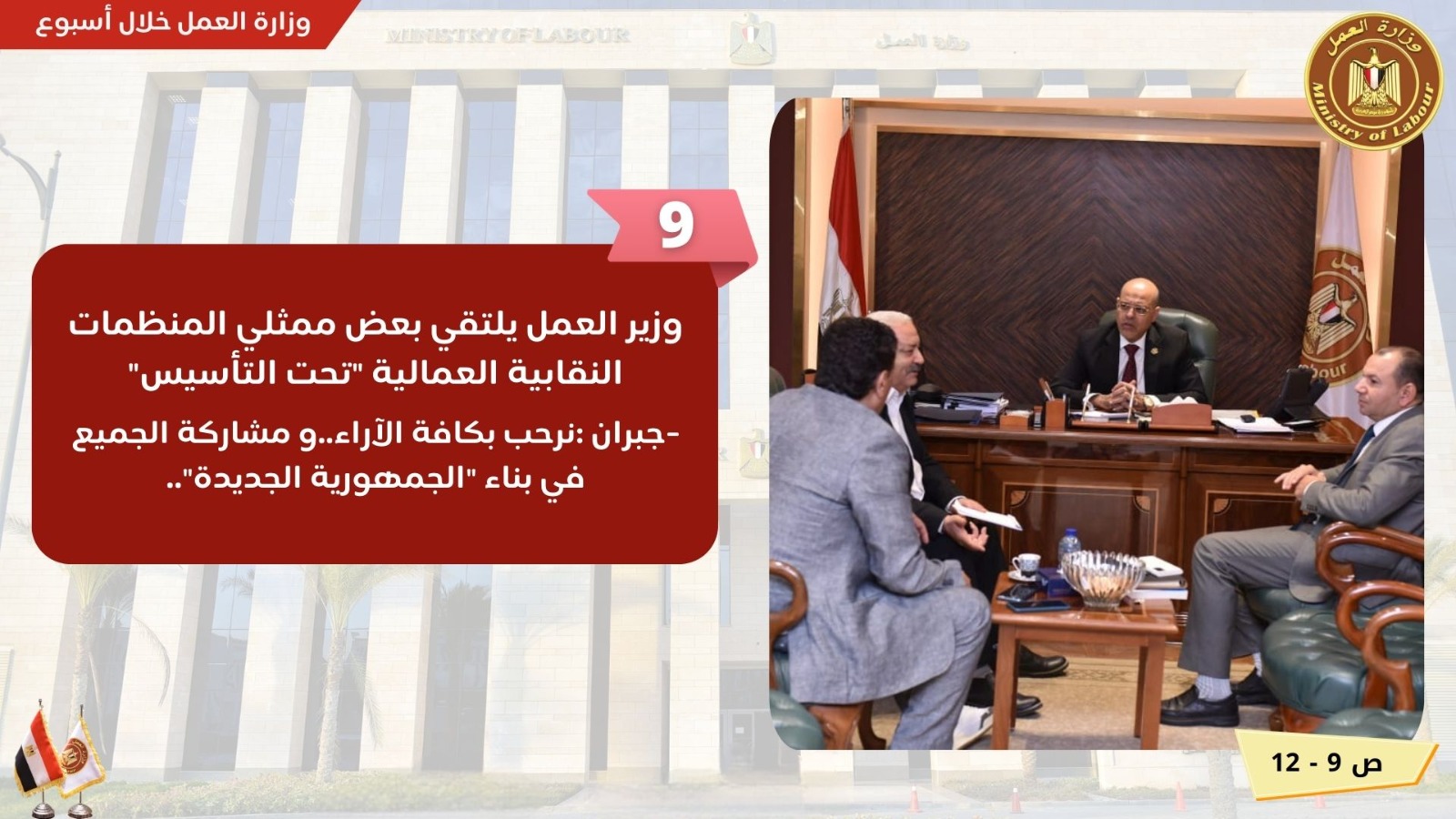 وقال جبران أنه بالتنسيق بين وزارتي العمل،والبترول والثروة المعدنية.. وأيضاً التقى وزير العمل ، مع سعد شعبان،ومحمد مسلم ،ممثلين عن منظمات نقابية عمالية "تحت التأسيس".. كما وجه ،الادارة العامة لرعاية العمالة غير المنتظمة ،ومديرية عمل محافظة الجيزة،بالاستمرار في متابعة أحوال العمال المصابين ،ضحايا حادث انهيار سقالة عليهم أثناء عملهم فى مبنى تحت الإنشاء يقع على طريق الفيوم بنطاق " الجيزة"..