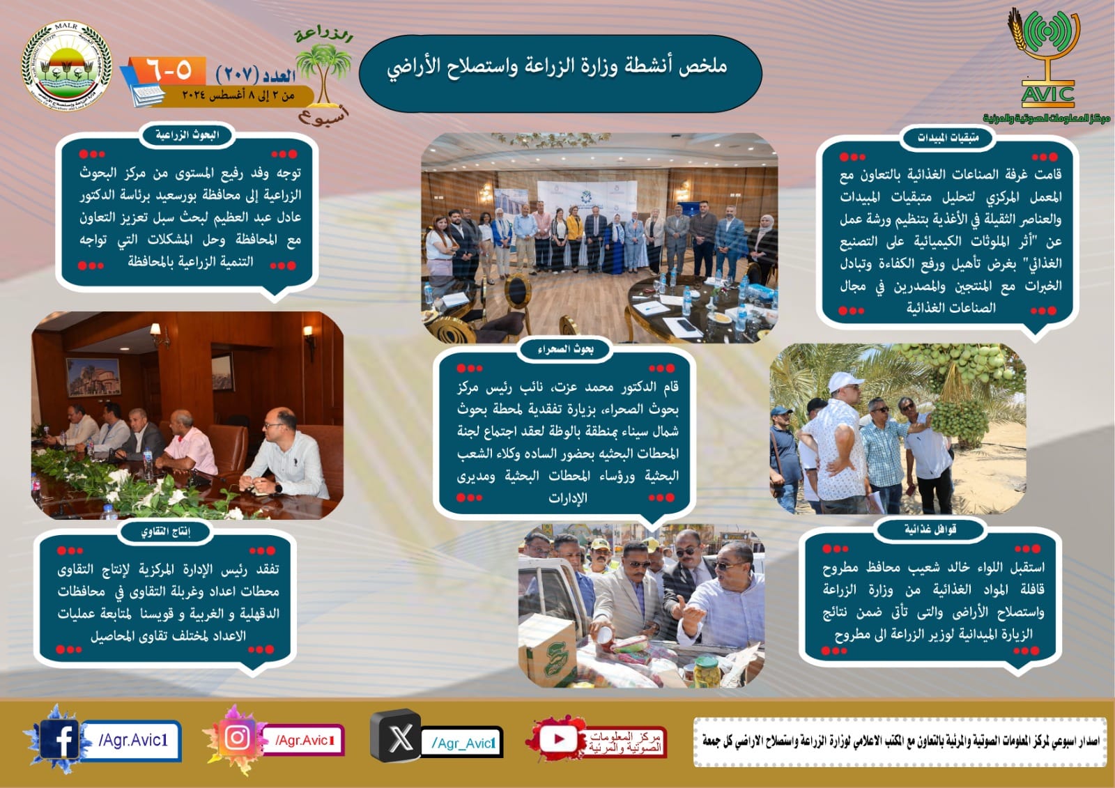أصدر مركز المعلومات الصوتية والمرئية، التابع لوزارة الزراعة واستصلاح الاراضي، "الانفوجراف الاسبوعي" في نسخته رقم ٢٠٧ حول الحصاد الاسبوعي لأهم أنشطة الوزارة، خلال الاسبوع الماضي في الفترة من ٢ وحتى ٨ اغسطس الجاري، وذلك بالتعاون مع المكتب الاعلامي للوزارة، كما أصدر المركز ايضا ملخصا بالفيديو، حول انشطة الوزارة خلال نفس الفترة.
