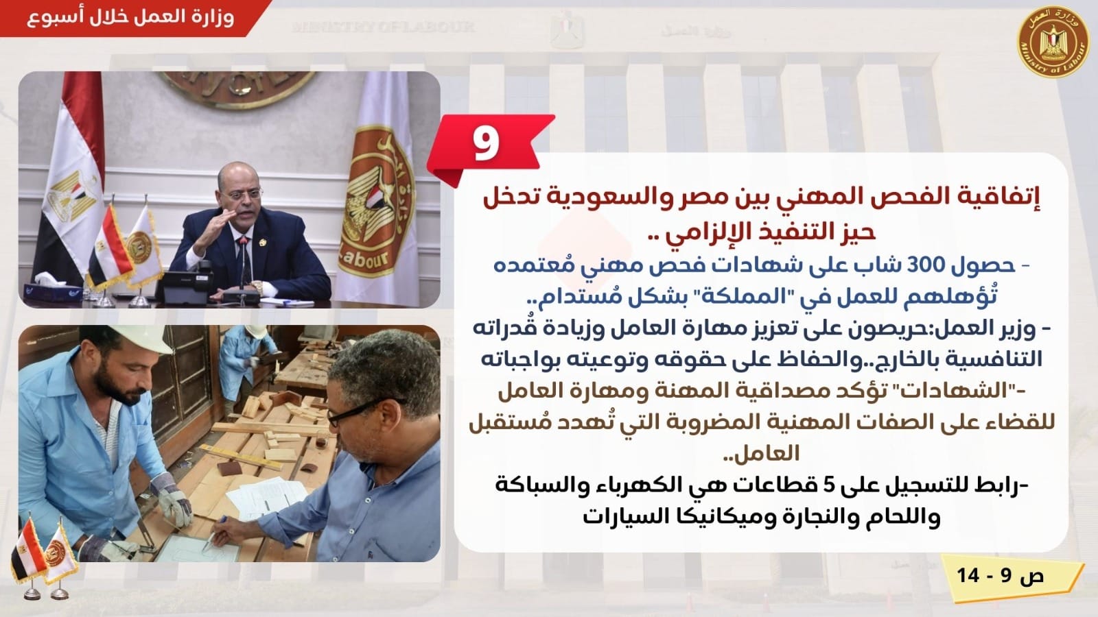 وأعلن وزير العمل ، عن حصول 300 شاب مصري على شهادات فحص مهني مُعتمدة، تؤكد إمتلاكهم المهارات اللازمة للعمل في المملكة العربية السعودية على 5 قطاعات هي :الكهرباء، والسباكة ، واللحام، والنجارة، وميكانيكا السيارات .