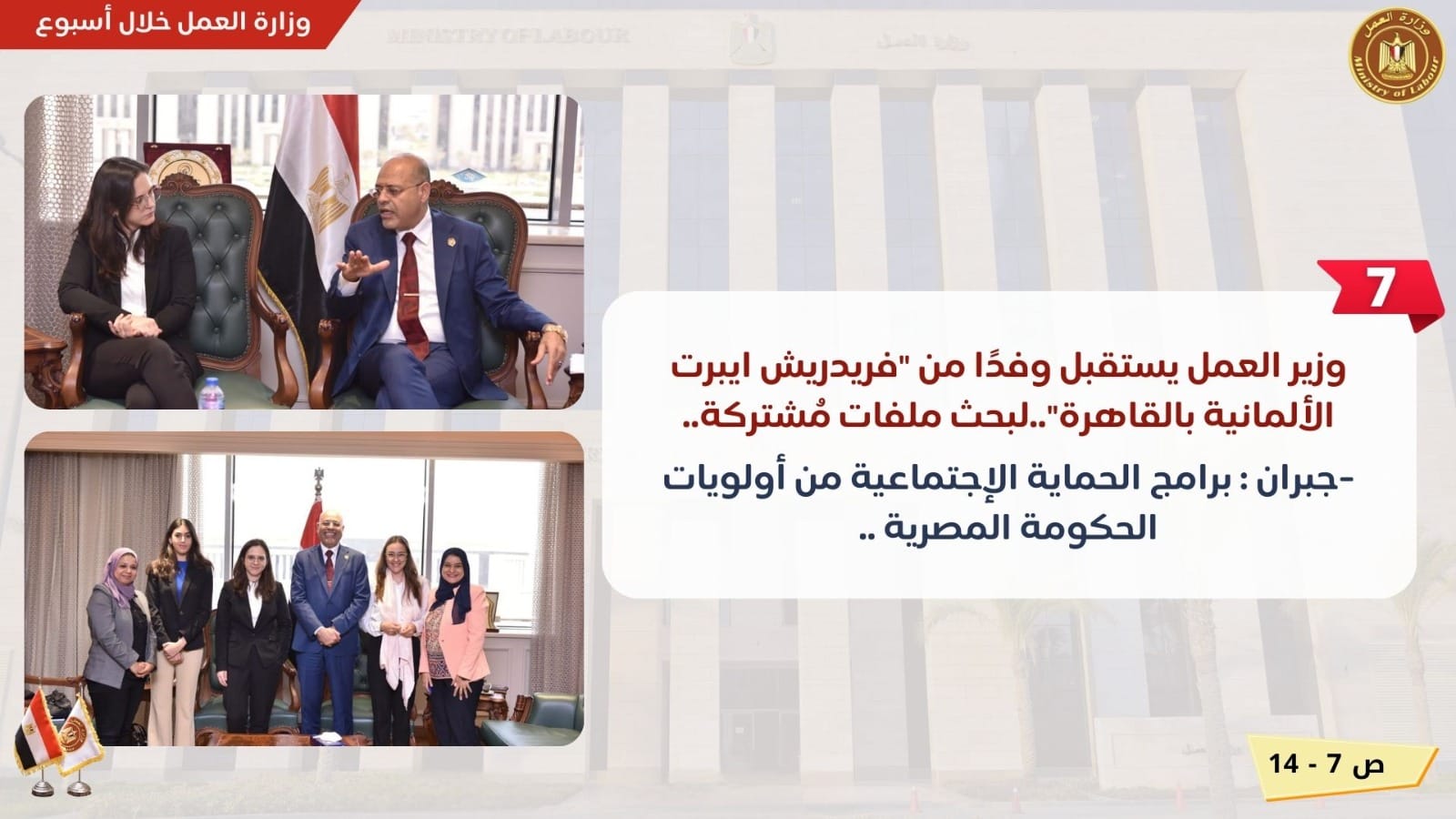 وخلال الأسبوع أيضًا إستقبل وزير العمل ،بديوان عام "الوزارة" بالعاصمة الإدارية الجديدة ،وفد من مؤسسة فريدريش ايبرت الألمانية بالقاهرة،الذي يضم رونيا شيفر الممثل المقيم للمؤسسة،وفرح غزال مدير برامج،وماريا ديلاسيجا من "المقر الرئيسي" .