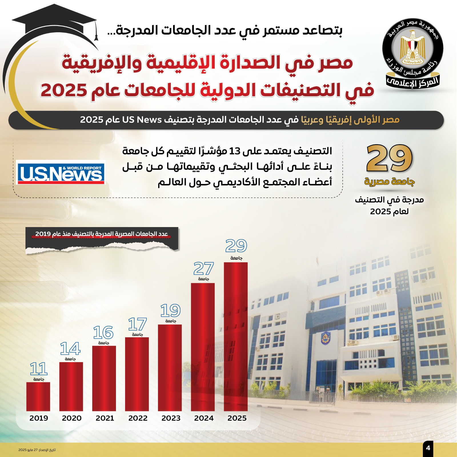 وفي السياق ذاته، أظهرت الإنفوجرافات تصدر مصر الدول العربية والإفريقية في عدد الجامعات المدرجة بتصنيف "US News" لعام 2025، بواقع 29 جامعة، مقارنةً بـ 27جامعة عام 2024، و11 جامعة عام 2019.