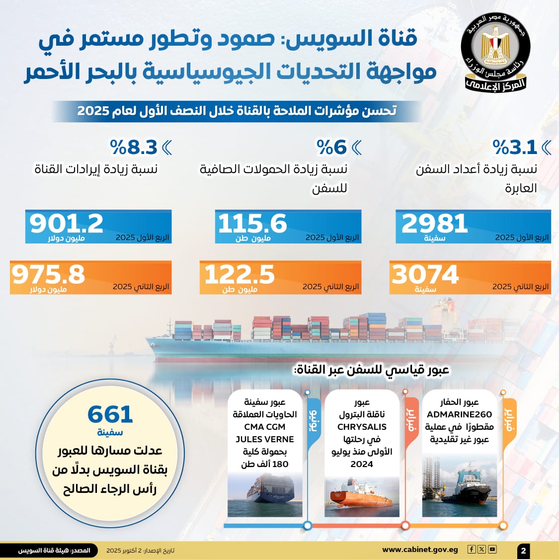 وأظهرت الإنفوجرافات، تحسن مؤشرات الملاحة بقناة السويس خلال النصف الأول لعام 2025، حيث زادت أعداد السفن العابرة بالقناة بنسبة 3.1%، لتصل إلى 3074 سفينة خلال الربع الثاني من عام 2025، مقارنة بـ 2981 سفينة خلال الربع الأول من العام ذاته.