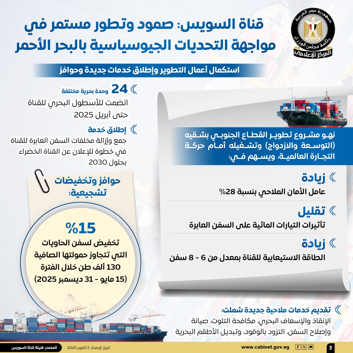 نشر المركز الإعلامي لمجلس الوزراء، عددًا من الإنفوجرافات عبر منصاته على مواقع التواصل الاجتماعي، سلط من خلالها الضوء على الصمود والتطور المستمر لقناة السويس في مواجهة التحديات الجيوسياسية بالبحر الأحمر.