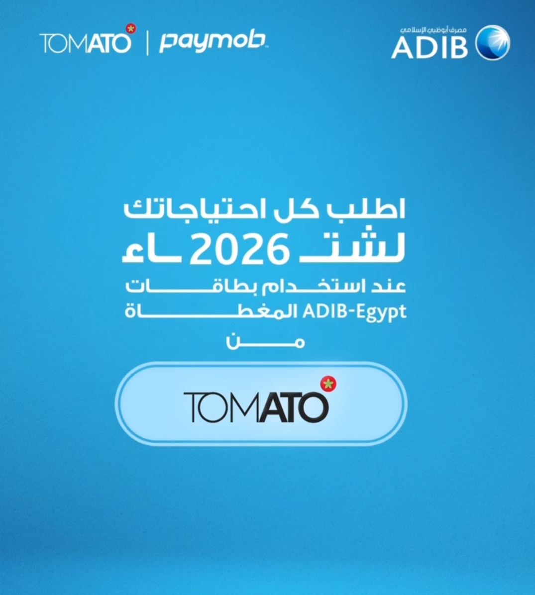 ويتيح المصرف خدمة تقسيط المشتريات من TOMATO حتى 9 أشهر بدون أرباح من خلال Paymob، وذلك عند الدفع بطاقات ADIB-Egypt المغطاة.