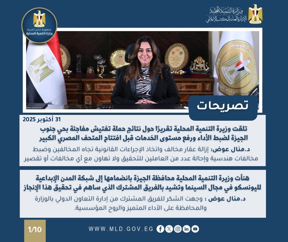 تلقت الدكتورة منال عوض، وزيرة التنمية المحلية والقائم بأعمال وزيرة البيئة، تقريرًا من قطاع التفتيش والمتابعة بالوزارة برئاسة المهندس هيثم الدسوقي، حول نتائج الحملة المفاجئة التي نفذها القطاع على حي جنوب الجيزة بمحافظة الجيزة، لمتابعة سير العمل ومستوى الخدمات المقدمة للمواطنين، مع التشديد على تنفيذ حملات النظافة ورفع الاشغالات على مدار الساعة فى ضوء افتتاح المتحف المصري الكبير للظهور بالمظهر اللائق والمشرف أمام العالم أجمع .