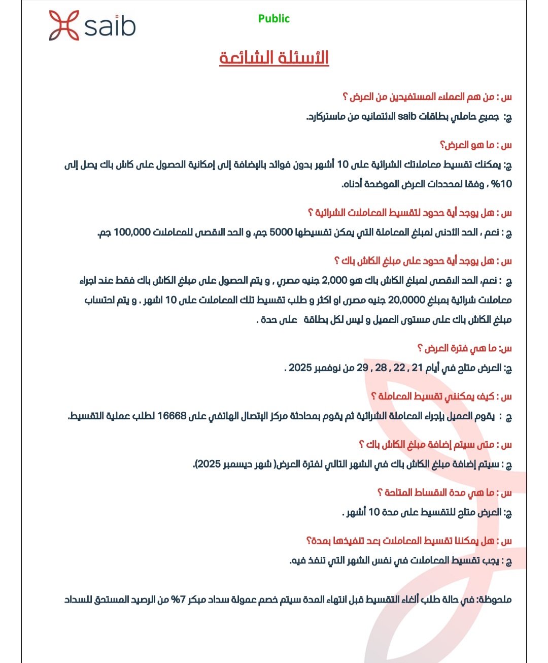 ويتيح البنك للعملاء إمكانية تقسيط المشتريات ببطاقة saib الإئتمانية من Mastercard على 10 شهور ب0% فائدة مع فرصة الاستمتاع بكاش باك يصل إلى 10%.