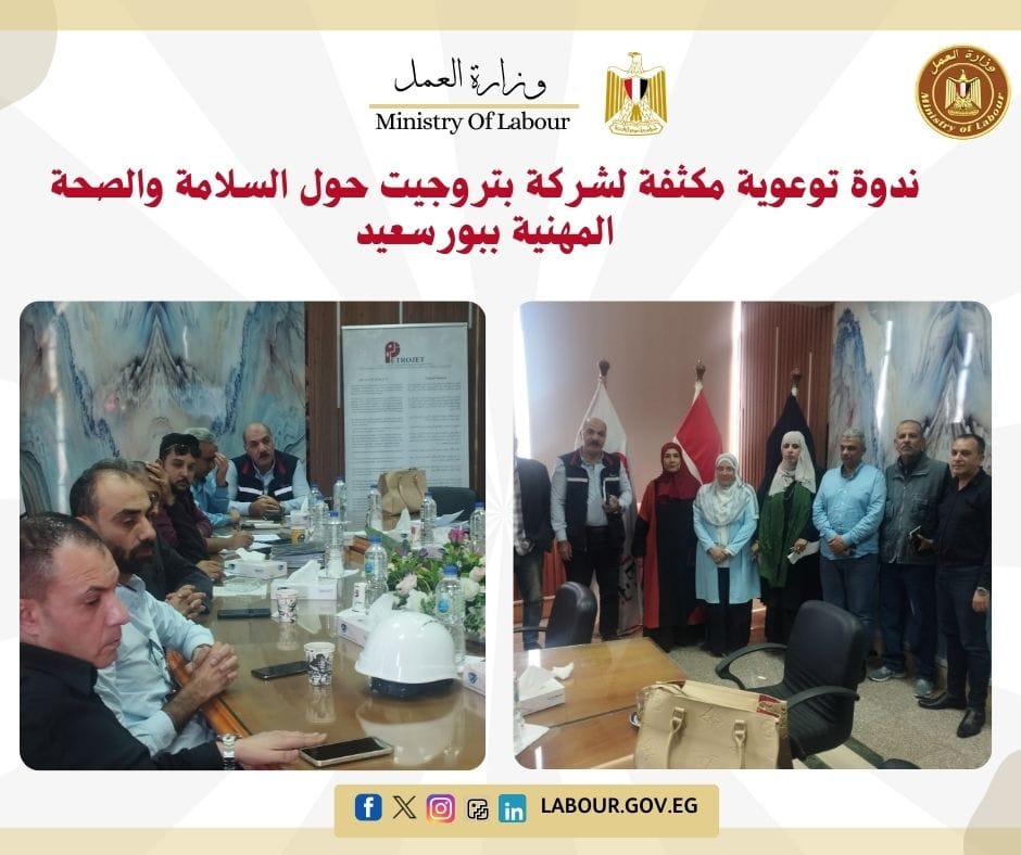 نظمت مديرية العمل ببورسعيد، ندوة تثقيفية موسعة للعاملين بشركة بتروجيت لتغليف المواسير، لمناقشة أهمية السلامة والصحة المهنية وأحكام قانون العمل الجديد رقم 14 لسنة 2025.