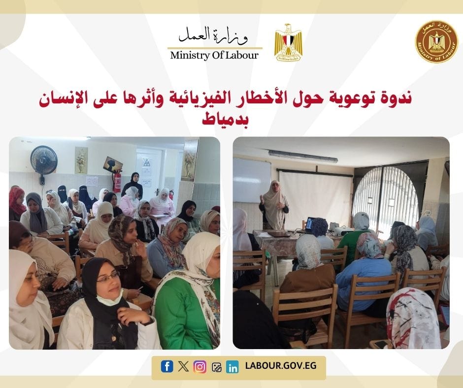 وعقدت مديرية العمل بدمياط، برئاسة مدير المديرية فتحي التلاوي، ندوة تثقيفية حول "الأخطار الفيزيائية وأثرها على الإنسان". ونظمت الندوة في مستشفى الأمراض الجلدية، حيث قامت مفتشة السلامة والصحة المهنية أشجان مظهر بالتعريف بهذه الأخطار وكيفية تجنبها، وذلك بحضور مديرة المستشفى وعدد من مديري الأقسام والعاملين.