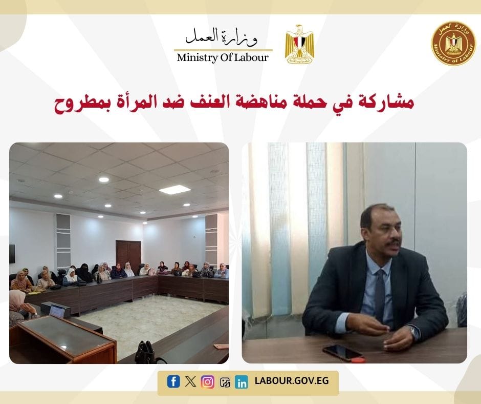 وشاركت مديرية العمل بمطروح، برئاسة المهندس مصطفى جابر، في ندوة موسعة ضمن حملة "16 يوم إتحدو يا نساء العالم" لمناهضة العنف ضد المرأة، بالتعاون مع مجمع إعلام مطروح. وتناولت الندوة المميزات التي منحها قانون العمل رقم 14 لسنة 2025 للمرأة العاملة، واستعرضت صور العنف المختلفة (الجسدي والنفسي)، موصية بضرورة توفير مراكز آمنة للدعم النفسي للمتضررات.