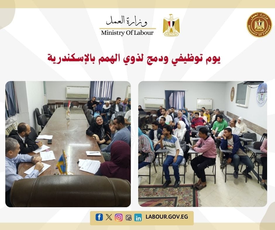 ونظمت مديرية العمل بالإسكندرية يومًا توظيفيًا بمقر المديرية، بالتعاون والتنسيق مع شركة فاركو ماك، وذلك لتوفير فرص عمل لائقة لذوي الهمم ودمجهم في سوق العمل. وأوضح مدير المديرية محمد كمال أنه تم إجراء مقابلات شخصية لعدد 20 طالب عمل، مع التأكيد على حقوقهم المالية والصحية والاجتماعية وتطبيق الحد الأدنى للأجور.