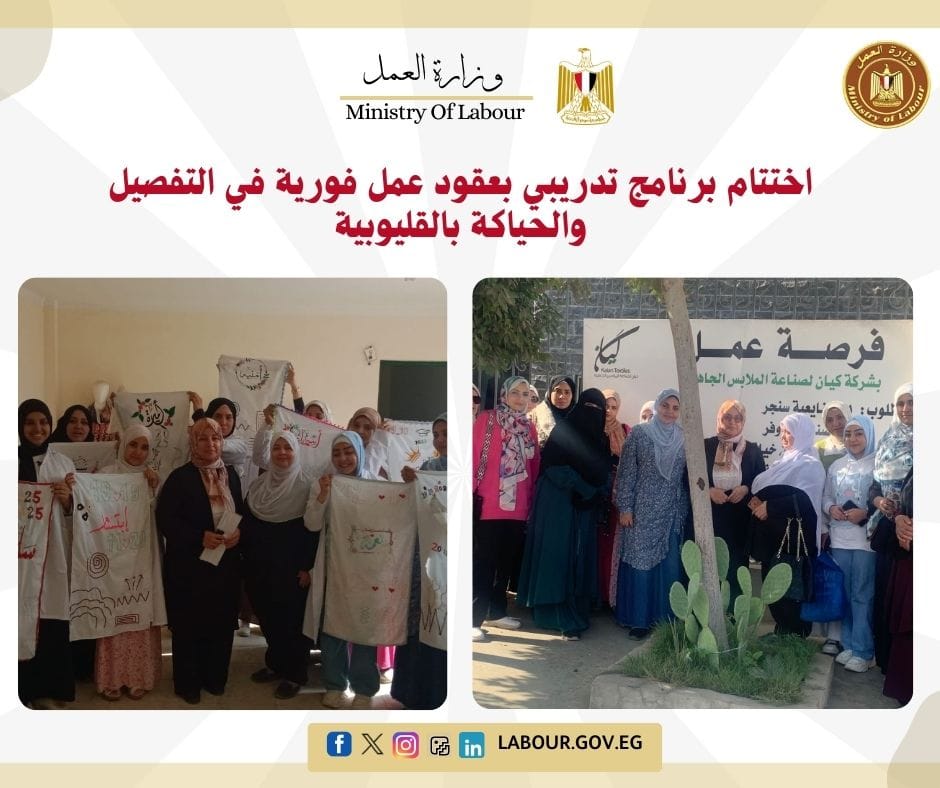 واختتمت مديرية العمل بالقليوبية، تحت إشراف وكيل الوزارة فوزي صابر، فعاليات برنامج تدريبي في مجال "التفصيل والحياكة" بمركز التدريب المهني بالخانكة لعدد 15 متدربة. وتميزت الدورة بنجاح المتدربات واجتيازهن للاختبارات، حيث تم توفير عقود عمل فورية لجميع المتدربات في شركة كيان لصناعة وتصدير الملابس الجاهزة بالعبور.