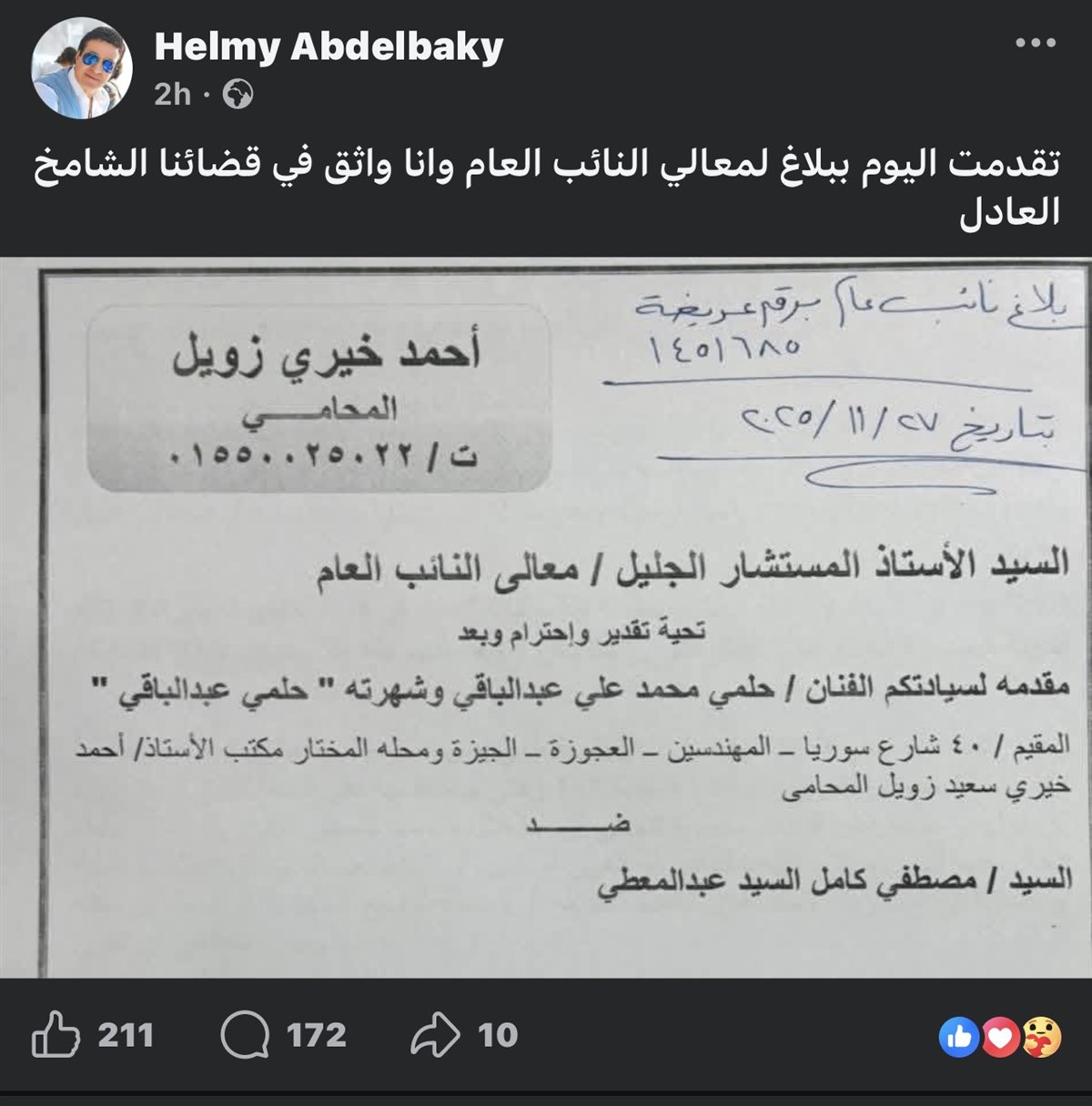 نشر حلمي عبد الباقي صورة من البلاغ عبر حسابه الشخصي بموقع التواصل الإجتماعي الأشهر “فيس بوك”، وأرفقها بتعليق قائلًا: “تقدمت اليوم ببلاغ لمعالي النائب العام وانا واثق في قضائنا الشامخ العادل”.