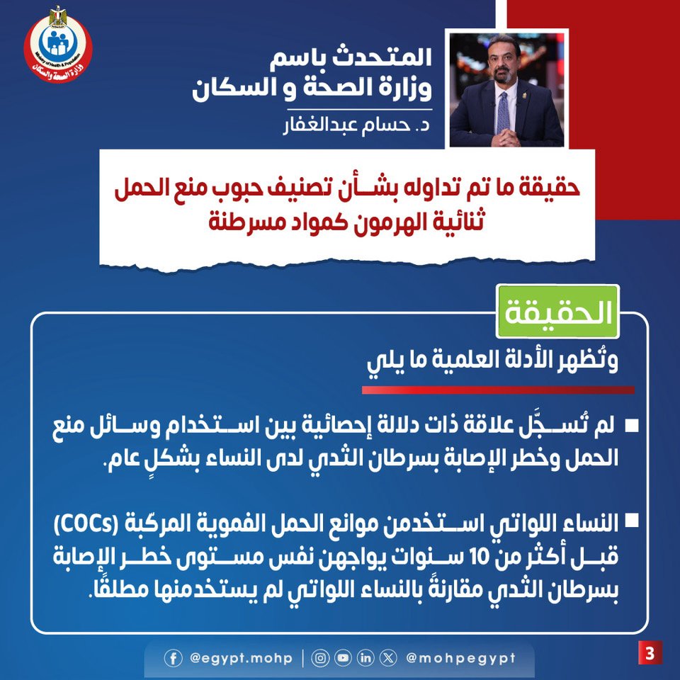 نفى الدكتور حسام عبد الغفار المتحدث الرسمي باسم وزارة الصحة، تسجيل أي علاقة ذات دلالة إحصائية بين استخدام وسائل منع الحمل وخطر الإصابة بسرطان الثدي لدى النساء بشكل عام.