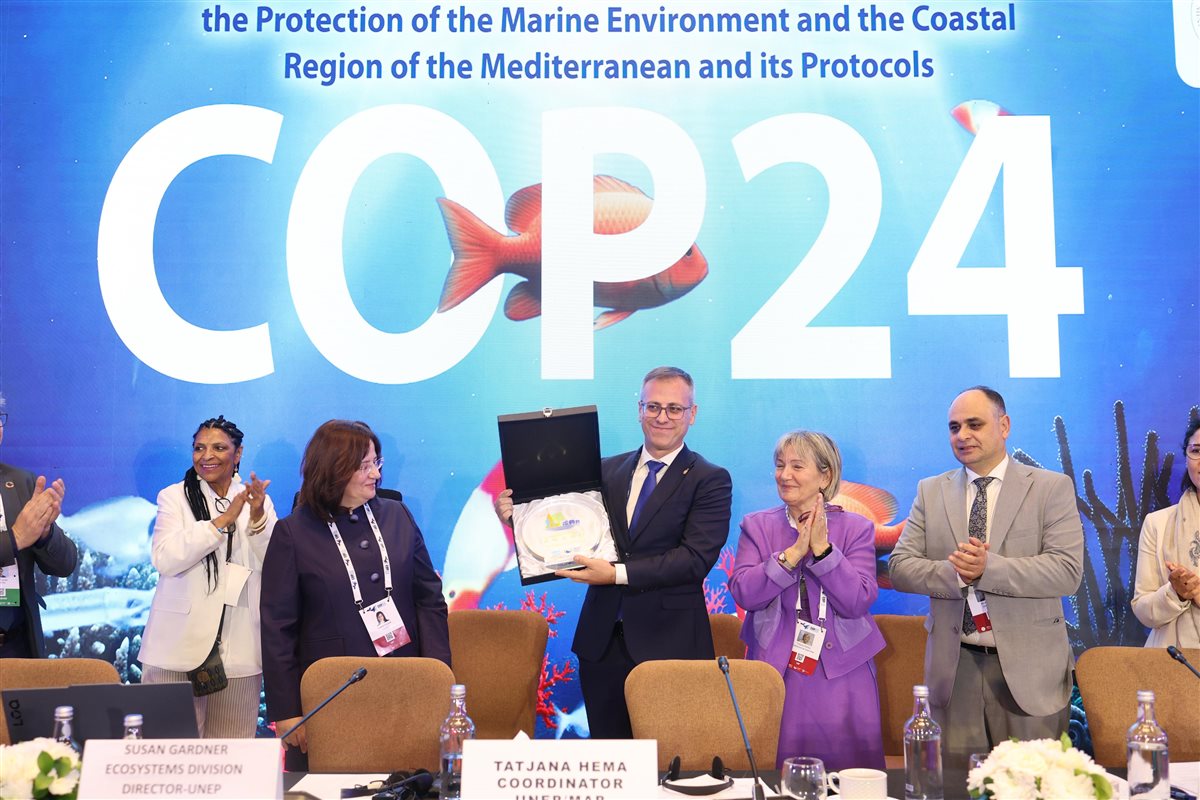 سلم الدكتور علي أبو سنة رئيس جهاز شئون البيئة المصري الدولة المستضيفة لمؤتمر الأطراف الرابع والعشرين لاتفاقية حماية بيئة البحر المتوسط من التلوث ( اتفاقية برشلونة) COP24، جائزة إسطنبول للمدينة الصديقة للبيئة في دورتها الخامسة لعام ٢٠٢٥/٢٠٢٤ لمدينة ملقا الإسبانية.