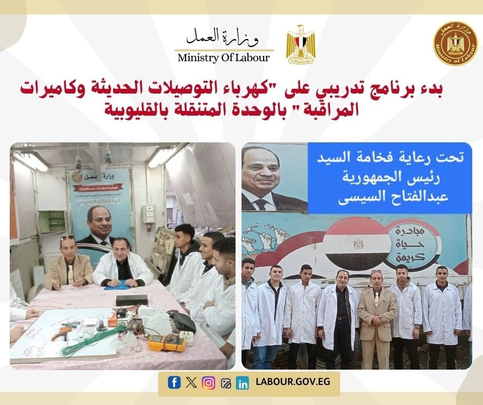 بدأت مديرية العمل بالقليوبية برنامجاً تدريبياً في مجال "كهرباء التوصيلات الحديثة وصيانة وتركيب وكاميرات المراقبة" بوحدة التدريب المتنقلة بقرية منية شبين القناطر (1 ديسمبر 2025).