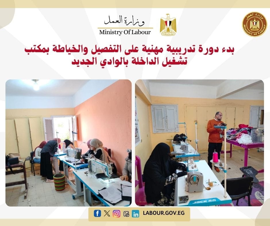 وقام مكتب تشغيل الداخلة بمديرية العمل بالوادي الجديد، تحت إشراف مدير عام المديرية أسامة إبراهيم محمد، ببدء الدورة التدريبية المهنية على مهنة التفصيل والخياطة لعدد (12) متدربة.
