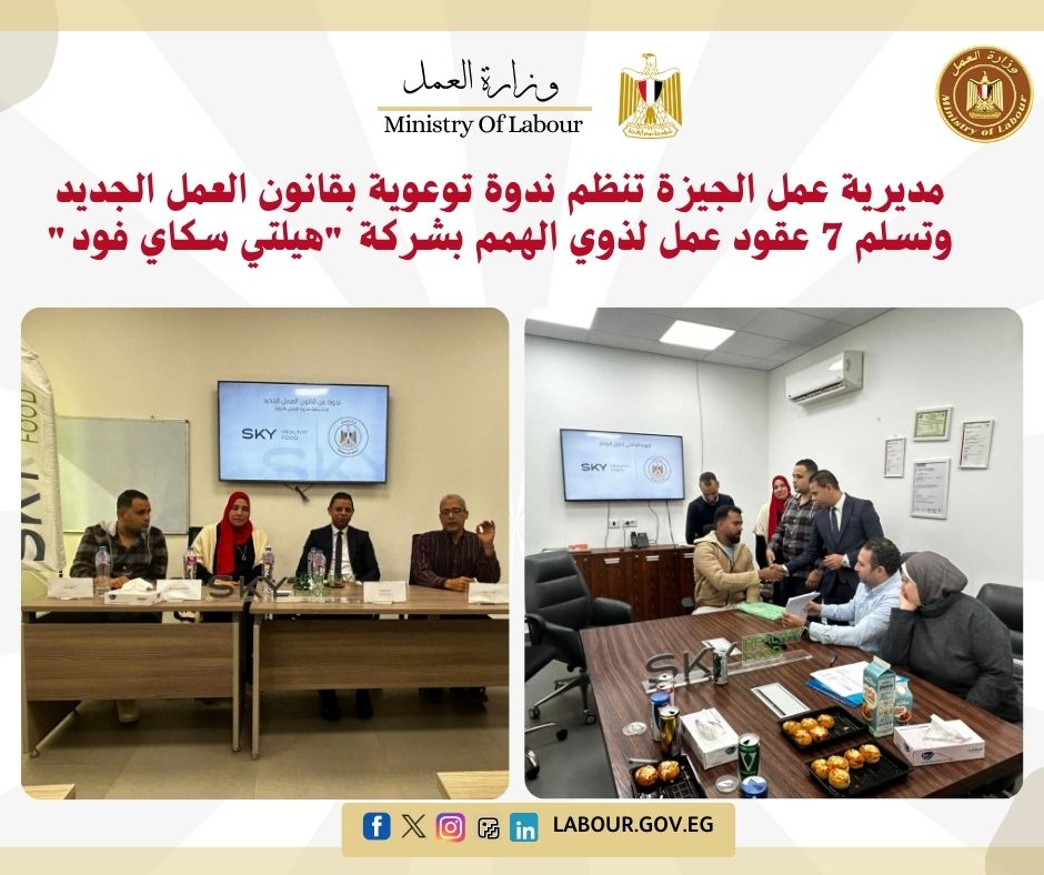 نظمت مديرية العمل بالجيزة، ندوة توعوية موسعة للعاملين في شركة "هيلتي سكاي فود" بمدينة 6 أكتوبر، لتكثيف التوعية بأحكام قانون العمل الجديد رقم (14) لسنة 2025.