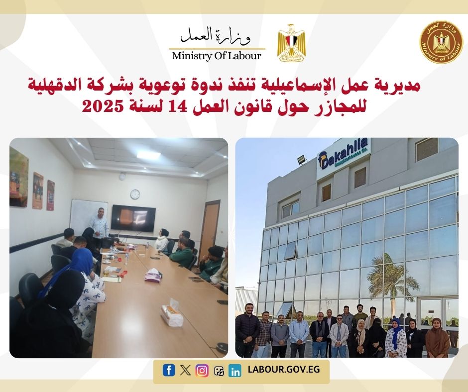 قامت مديرية عمل الإسماعيلية، تحت إشراف مدير المديرية الدكتور أيمن شعبان، بتنظيم ندوة توعوية وإرشادية بمقر شركة الدقهلية للمجاز، تنفيذًا لتوجيهات وزير العمل محمد جبران.