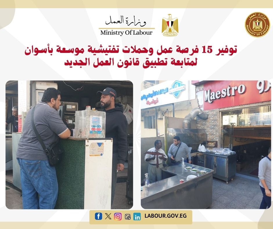وأكد محمود أحمد عيسى وكيل مديرية العمل بأسوان، أن هذه الإجراءات تأتي ضمن خطة متكاملة لتوفير حياة كريمة للمواطنين وتحسين جودة الحياة، مشيراً إلى أن المديرية لن تتهاون في اتخاذ الإجراءات القانونية تجاه المنشآت المخالفة، مع الاستمرار في دعم الشباب وتمكينهم اقتصادياً عبر فرص عمل حقيقية ومستدامة.