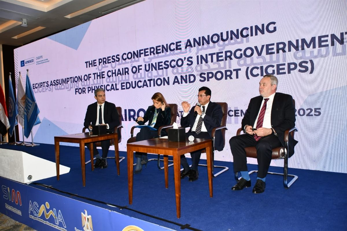 نظّمت وزارة الشباب والرياضة، مساء اليوم، مؤتمرًا صحفيًا للإعلان الرسمي عن تولّي جمهورية مصر العربية، ممثلة في معالي الأستاذ الدكتور أشرف صبحي وزير الشباب والرياضة، رئاسة اللجنة الحكومية الدولية للتربية البدنية والرياضة (CIGEPS) التابعة لمنظمة اليونسكو، وذلك بحضور قيادات منظمة اليونسكو، وممثلي السلك الدبلوماسي، وعدد من القيادات الرياضية والإعلامية.