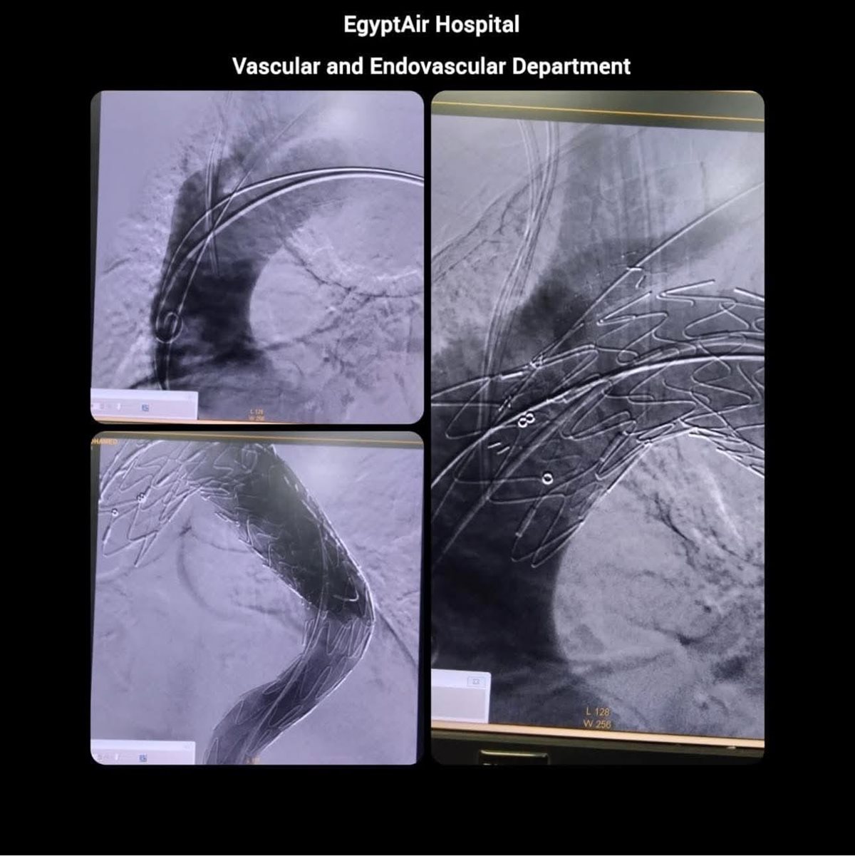 تم تركيب دعامتين أورطيتين من شركة Lifetech Scientific Corporation (Ankura™️) تنتهي فوق الشرايين الطرفية للأمعاء لحمايه الشريان المصاب دون الإخلال بوظائف الشريان البطني المغذي للأمعاء العلويه ، مع الحفاظ على تدفق الدم في الشريان تحت الترقوي ( تحت الرقبة ) الأيسر باستخدام دعامة إضافية.