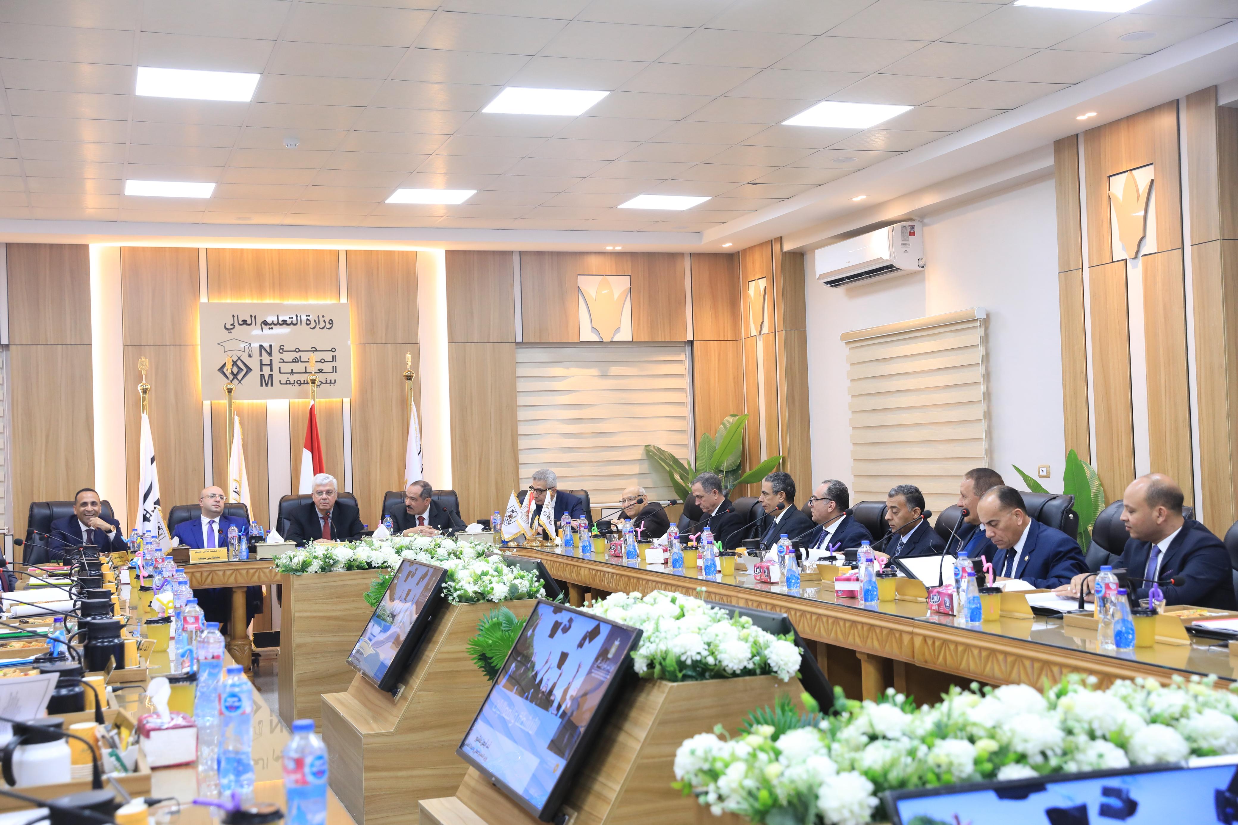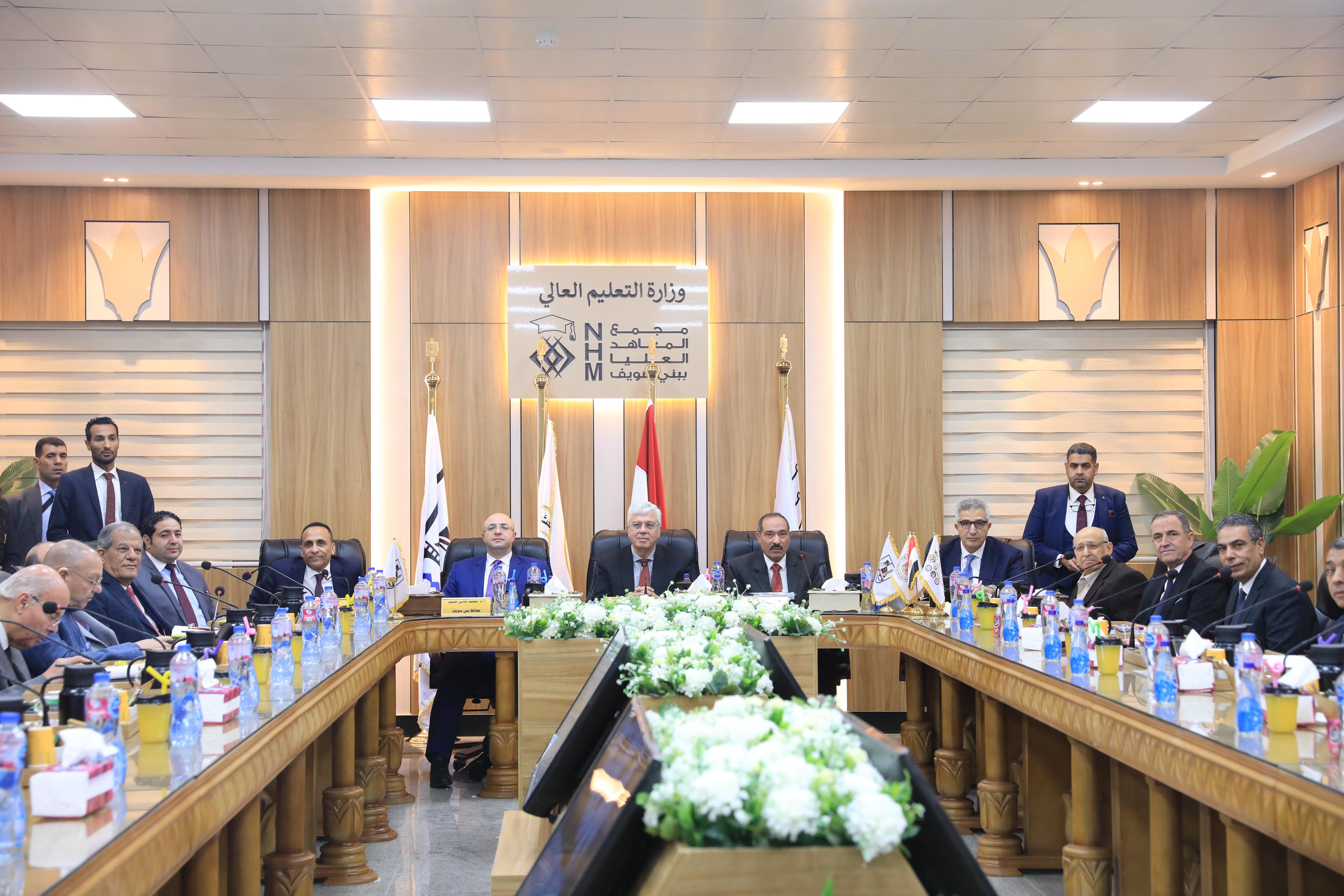 بحضور د.محمد هاني محافظ بني سويف، ود.جودة غانم رئيس قطاع التعليم وأمين المجلس الأعلى لشئون المعاهد العالية الخاصة، ود.مصطفى رفعت أمين المجلس الأعلى للجامعات، ود.عبدالوهاب عزت أمين المجلس الأعلى للجامعات الخاصة، ود.أحمد الجيوشي أمين المجلس الأعلى للتعليم التكنولوجي، ود.عادل عبدالغفار المستشار الإعلامي والمتحدث الرسمي للوزارة ، والسادة أعضاء المجلس، وذلك بمجمع المعاهد العليا ببني سويف.