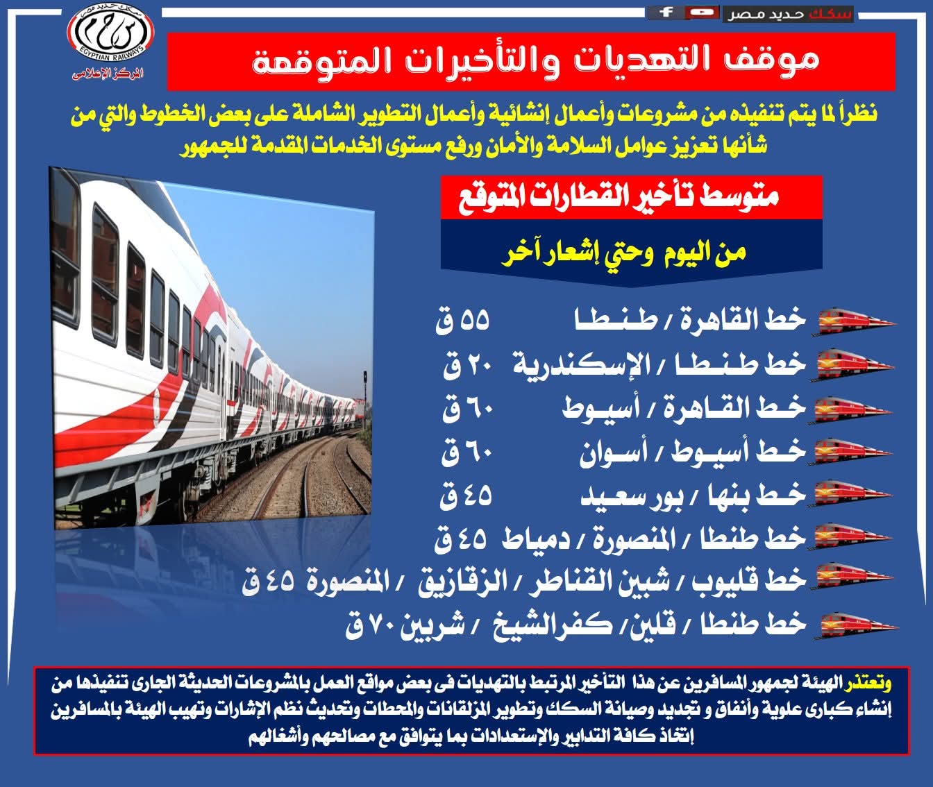 وتشهد شبكة السكك الحديدية تنفيذ مشروعات قومية لتحديث البنية الأساسية ورفع كفاءة التشغيل وتحسين عوامل السلامة والأمان، ما يؤدي إلى تأخيرات مؤقتة لحين الانتهاء من الأعمال.
