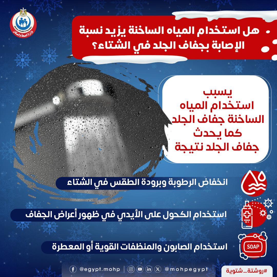 ومن جانبها وفي إطار منشوراتها الدورية ، حذرت وزارة الصحة والسكان ، من خلال صفحتة الرسمية علي موقع التواصل الإجتماعي «فيس بوك » من استخدام المياه الساخنة لما تسببه من زيادة نسبة الإصابة بجفاف الجلد في فصل الشتاء .