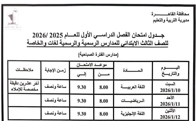 تبدأ السبت 3 يناير 2026.. محافظ القاهرة يعتمد جدول امتحانات الفصل الدراسي الأول