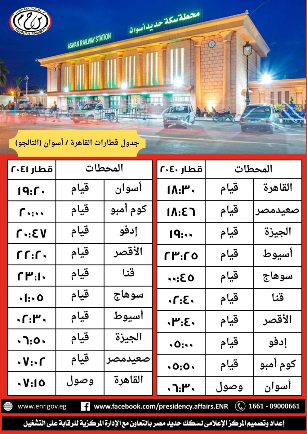- اعتبارًا من يوم الخميس الموافق 22/1/2026 تشغيل قطار 1938 (مكيف) من القاهرة/ أسوان حتى يوم الأحد الموافق 15/2/2026 حيث يقوم من القاهرة الساعة 22:50 ويصل أسوان الساعة 10:25 طبقًا للجدول المرفق.
