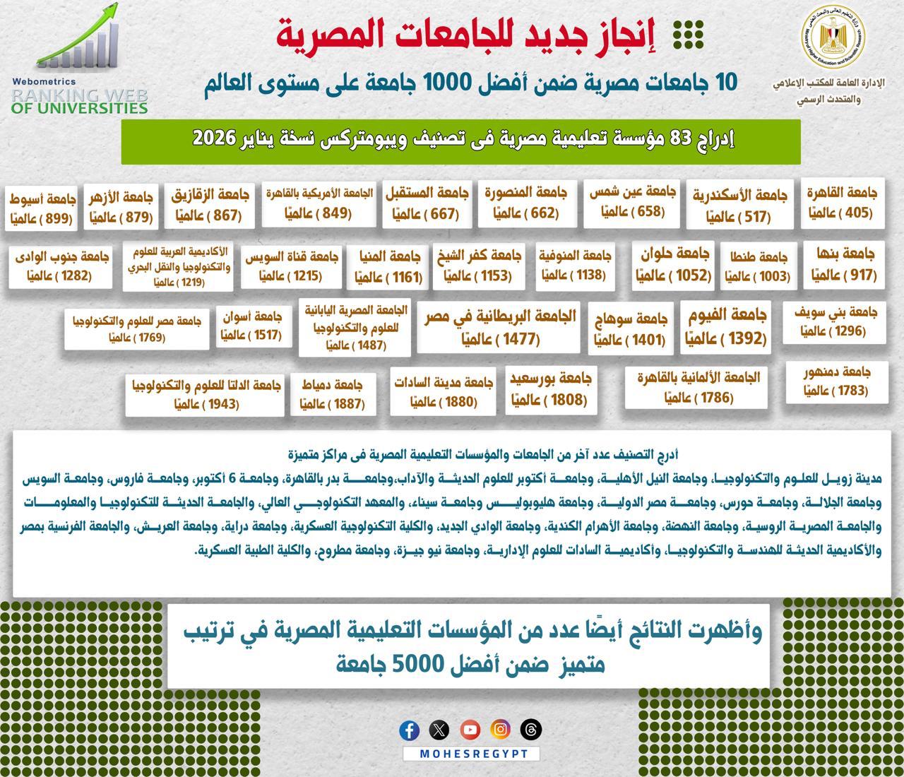 أعلن تصنيف ويبومتركس العالمي (Webometrics Ranking of World Universities)، نتائج نسخة يناير لعام 2026 والتي أظهرت إدراج 83 مؤسسة تعليمية مصرية، لتحافظ على زيادة متواصلة بنتائج التصنيف حيث تم إدراج 76 مؤسسة في عام 2022، ثم 78 مؤسسة في عام 2023، ثم 79 مؤسسة في 2024، ثم 81 مؤسسة في نسخة يوليو 2024، وأشار الوزير إلى أهمية نتائج الجامعات المصرية في تصنيف ويبومتركس العالمي والذي يهتم بتقييم الجامعات والمؤسسات الأكاديمية وفق مدى حضورها الرقمي وتأثيرها العلمي وانفتاحها البحثي وتميزها الأكاديمي، حيث لم يعد التطوير مجرد تحسين محلي، بل بات يهدف لمواكبة أحدث التوجهات العالمية في التحول الرقمي وتعزيز التواجد على الشبكة العنكبوتية.