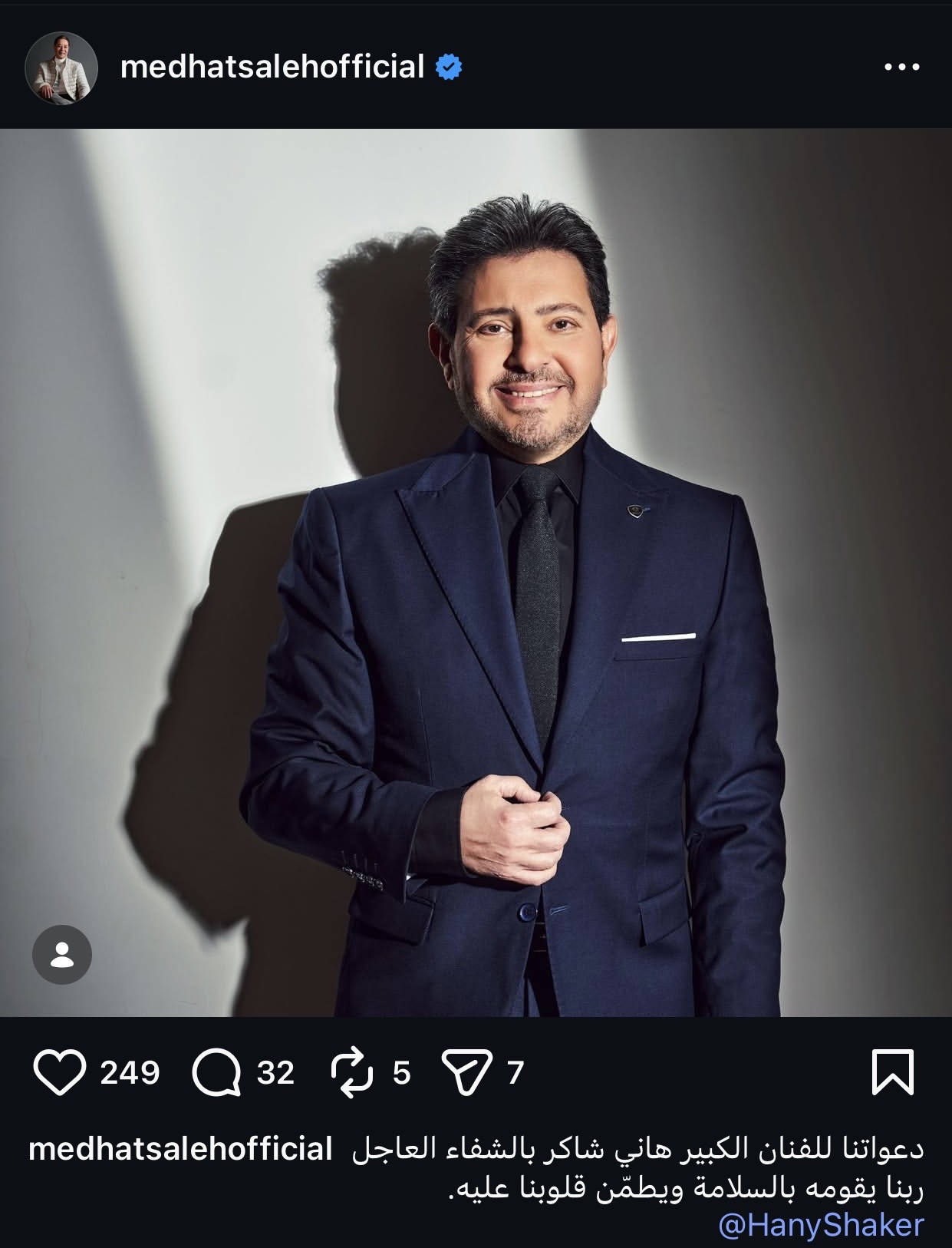 وكتب مدحت صالح عبر حسابه الشخصي بموقع إنستجرام: “دعواتنا للفنان الكبير هاني شاكر بالشفاء العاجل.. ربنا يقومه بالسلامة ويطمّن قلوبنا عليه”.