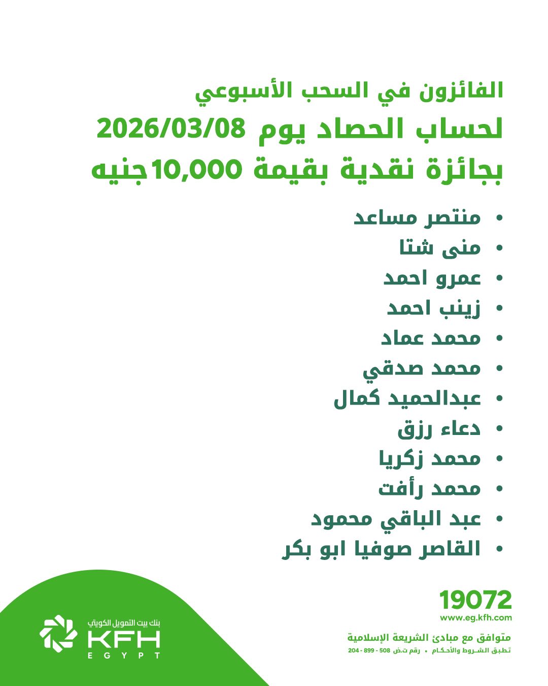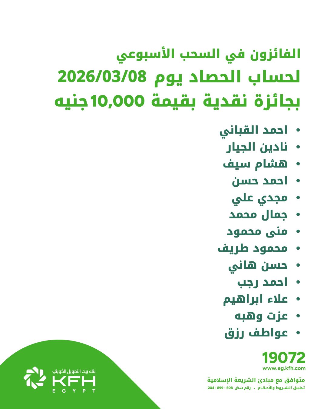 أعلن بنك بيت التمويل الكويتي – مصر عن الفائزين في السحب الأسبوعي لحساب الحصاد، والذي أُجري يوم 8-3-2026، وأسفر عن فوز عدد من العملاء بجوائز نقدية بقيمة 10,000 جنيه لكل فائز.