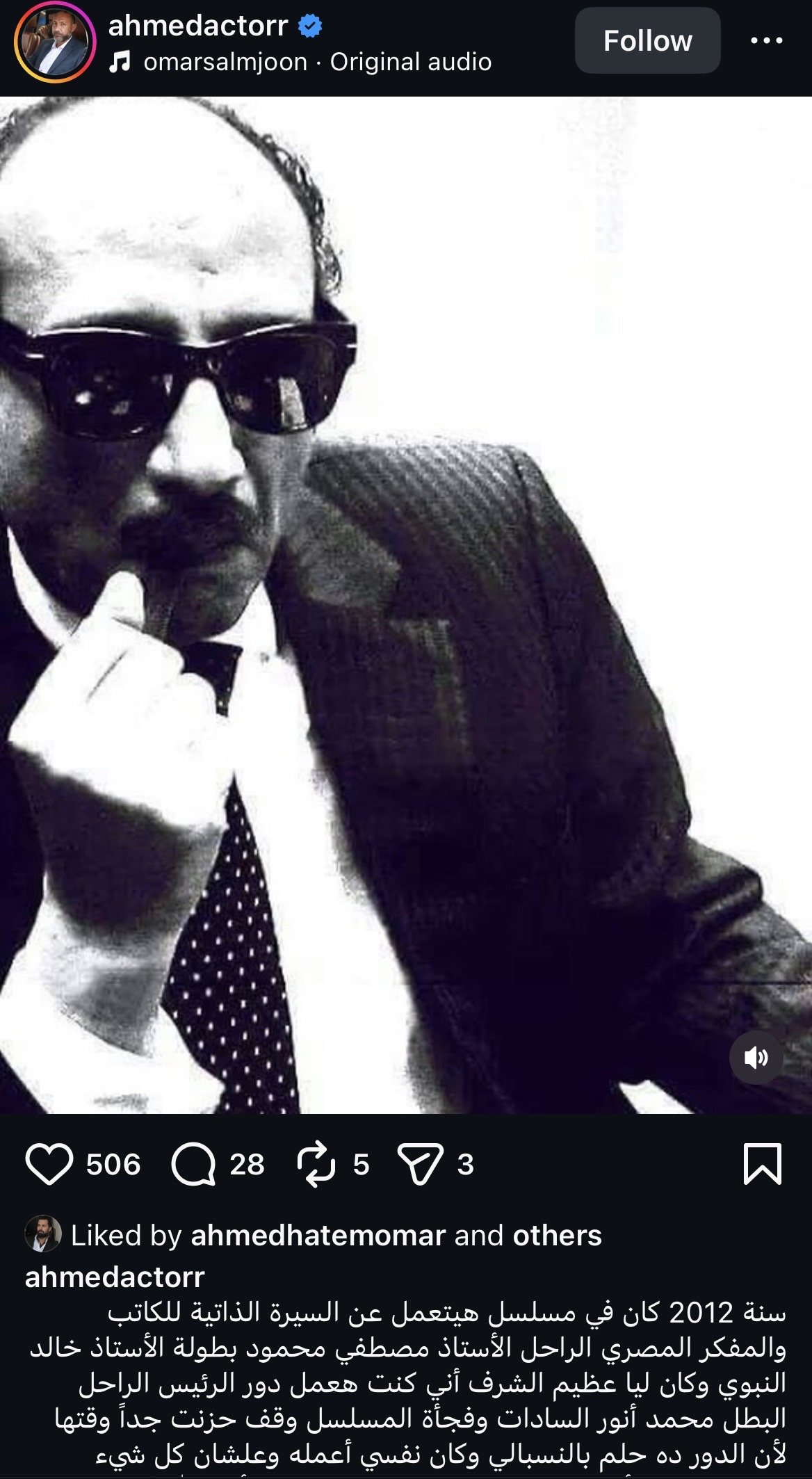 وكتب أحمد فهيم عبر حسابه على انستجرام: "سنة 2012 كان فيه مسلسل هيتعمل عن السيرة الذاتية للكاتب والمفكر المصري الراحل الدكتور مصطفى محمود بطولة خالد النبوي وكان ليا عظيم الشرف أني كنت هعمل دور الرئيس الراحل البطل محمد أنور السادات وفجأة المسلسل وقف.. حزنت جدًا وقتها لأن الدور ده حلم بالنسبالي وكان نفسي أعمله وعلشان كل شيء بميعاد عرفت أن المسلسل خرج للنور وهيتعمل بأذن الله في 2027 أتمني من الله عز وجل أن يكون ليا نصيب في هذا العمل المحترم وأني أحقق حلمي بتجسيد شخصية الزعيم الراحل البطل محمد أنور السادات، اللهم عوضًا يليق بجلال قدرك وعظيم سلطانك، الله قادر دعواتكم.. ملحوظة الصورة دي صورتي من الفوتوغرافيا سنة 2012”.