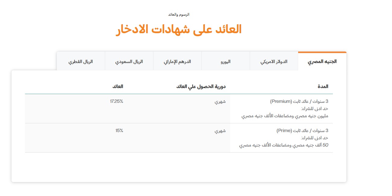1- شهادة Premium لمدة 3 سنوات بعائد شهري 17.25%، حيث تم تخفيض الحد الأدنى من 5 ملايين جنيه إلى 1 مليون جنيه.