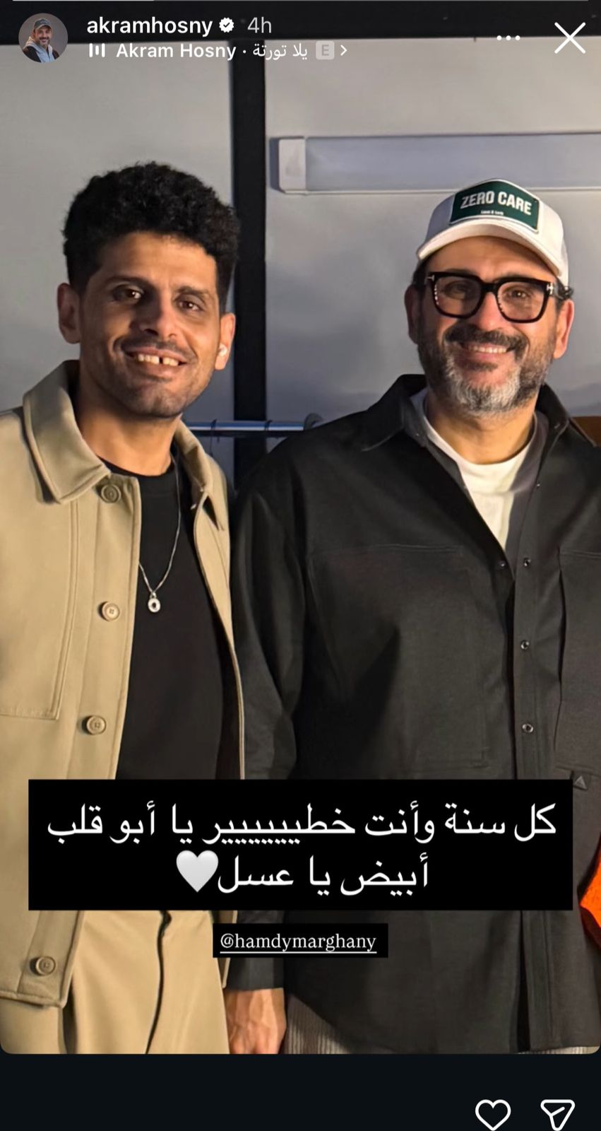 حرص الفنان أكرم حسني على تهنئة حمدي المرغني بمناسبة عيد ميلاده عبر حسابه الشخصي على موقع التواصل الاجتماعي انستجرام.