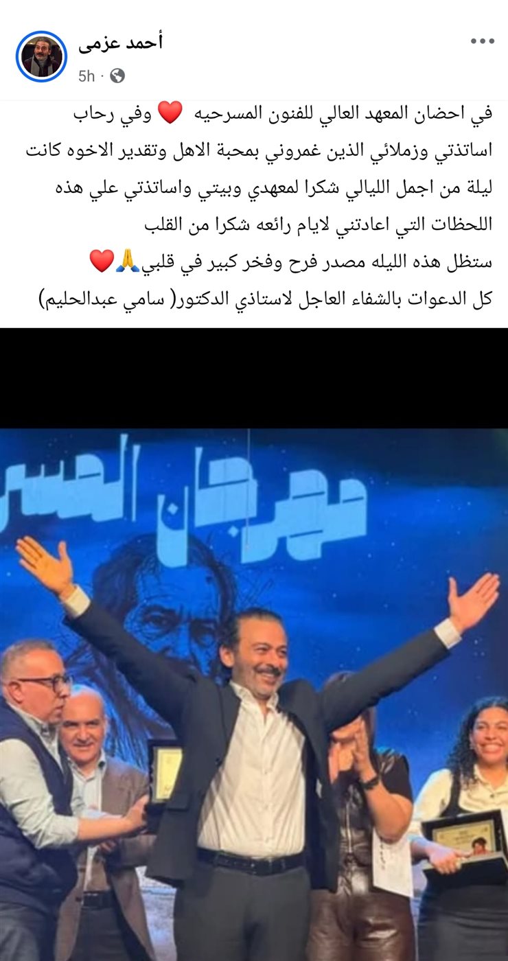عبّر الفنان أحمد عزمي في منشور على صفحته الرسمية بـ«فيسبوك» عن بالغ تقديره وامتنانه لمعلميه وزملائه في المعهد العالي للفنون المسرحية، وذلك بعد تكريمه في مهرجان المسرح العالمي، في ليلة وصفها بأنها من أجمل لياليه.