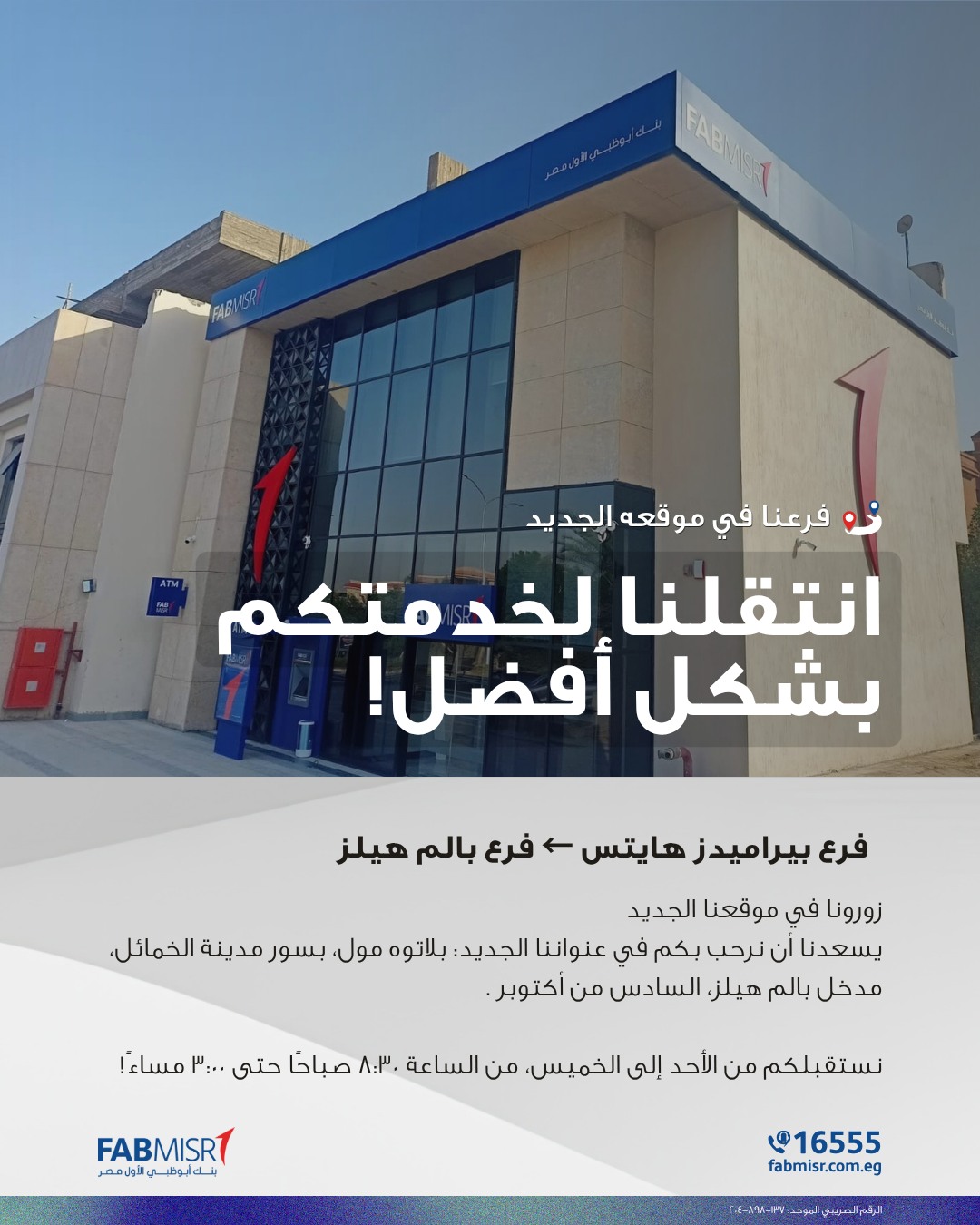 أعلن بنك أبوظبي الأول مصر (FABMISR) عن نقل فرعه في بيراميدز هايتس رسميًا إلى فرع بالم هيلز السادس من أكتوبر.