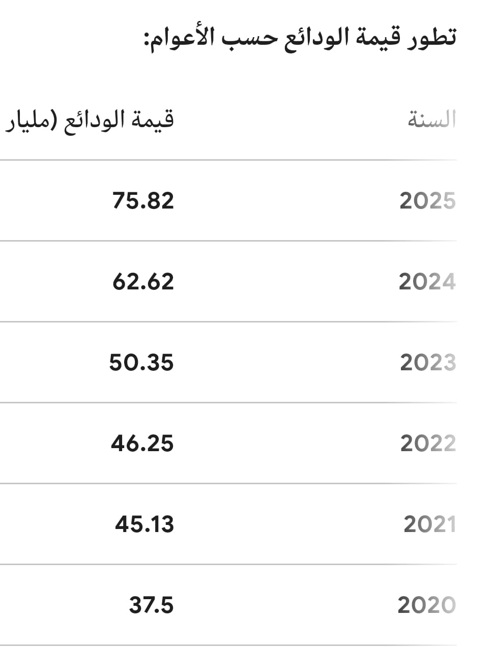 وبالنظر إلى التطور السنوي، ارتفعت الودائع من 37.5 مليار جنيه في 2020 إلى 45.13 مليار جنيه في 2021، ثم إلى 46.25 مليار جنيه في 2022، قبل أن تسجل قفزة ملحوظة إلى 50.35 مليار جنيه في 2023. واستمرت وتيرة النمو في التسارع خلال عامي 2024 و2025، لتصل الودائع إلى 62.62 مليار جنيه في 2024، ثم إلى 75.82 مليار جنيه في 2025، وهو ما يعكس تسارعًا واضحًا في جذب السيولة خلال العامين الأخيرين.