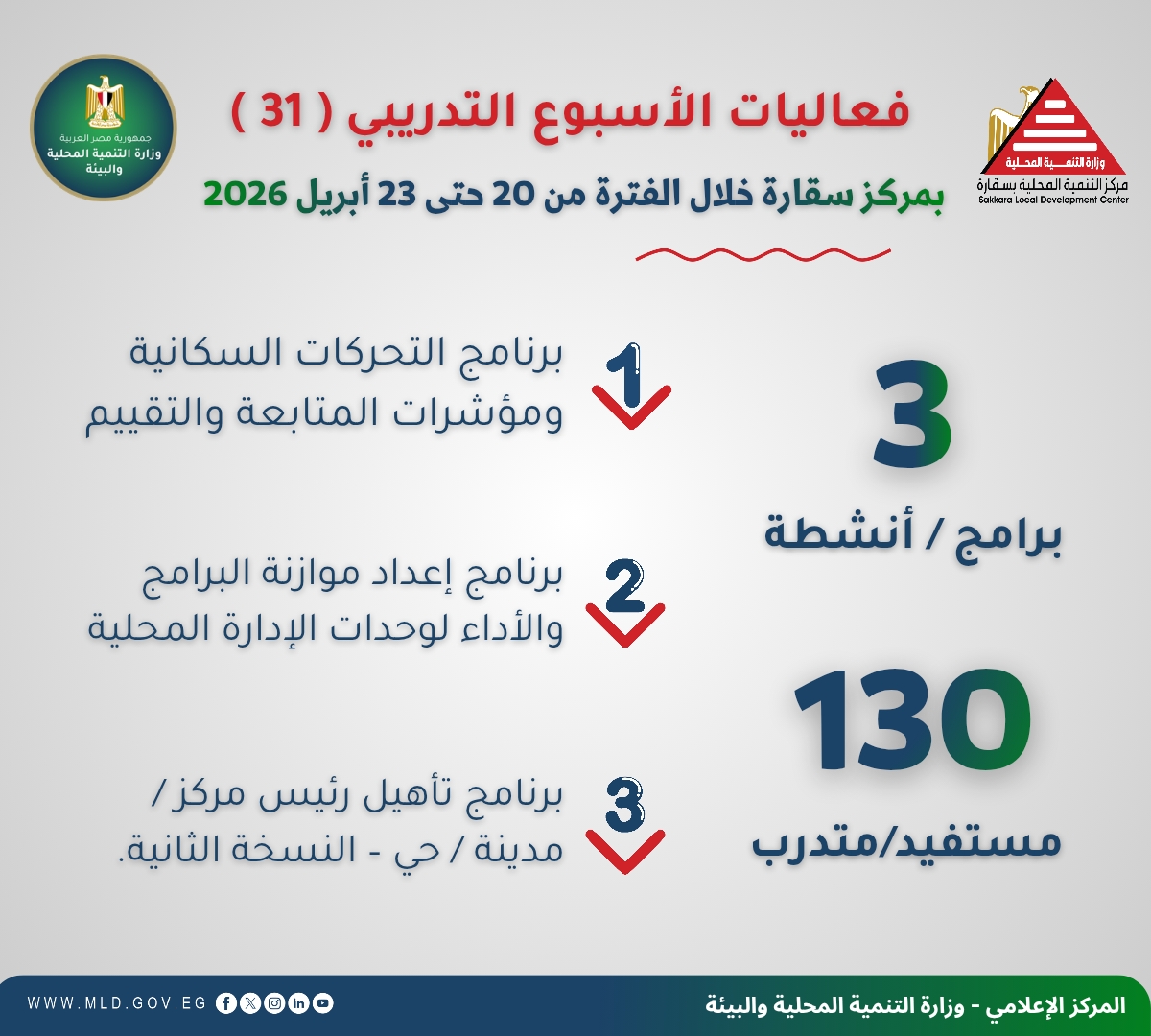 أعلنت الدكتورة منال عوض وزيرة التنمية المحلية والبيئة ، عن إنطلاق فعاليات الأسبوع التدريبى الحادي والثلاثين من الخطة التدريبية 2025 / 2026 خلال الفترة من 20 / 4 / 2026 وحتى 23 / 4 / 2026 وذلك بمركز التنمية المحلية للتدريب بسقارة .