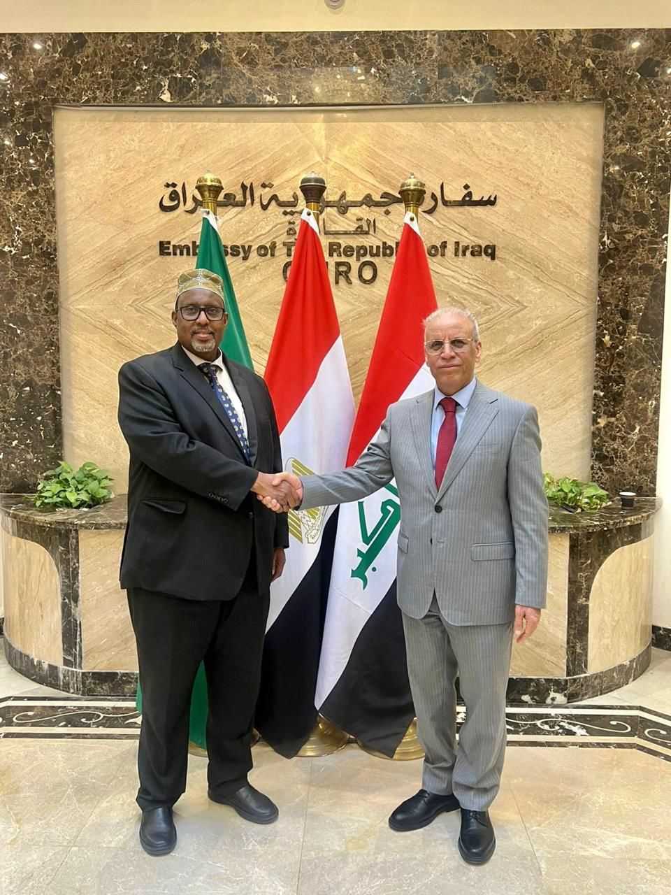 التقى علي عبدي أواري سفير جمهورية الصومال الفيدرالية لدى مصر والمندوب الدائم لدى جامعة الدول العربية، نظيره قحطان طه خلف، سفير جمهورية العراق بالقاهرة والمندوب الدائم لدى الجامعة، وذلك في إطار تعزيز العلاقات الثنائية والتشاور المستمر بين البلدين.